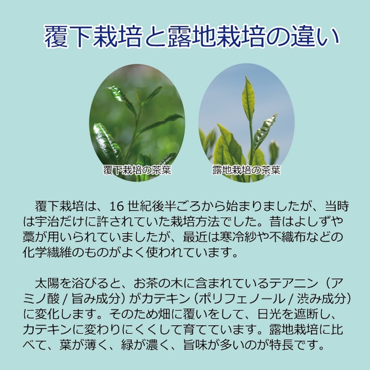摘み取った茶葉は、蒸したあと揉まずに乾燥させます。これを碾茶(てんちゃ)といいます。この碾茶を石臼でじっくりと時間をかけて挽きました。 石臼で挽くことにより、粒子が細かくなり、泡立ちがよく、口当たりのよいまろやかな抹茶になります。石臼で1時間挽いてできるのは、たった40gです。