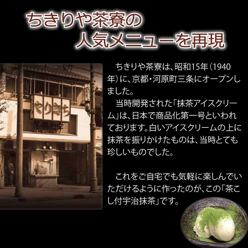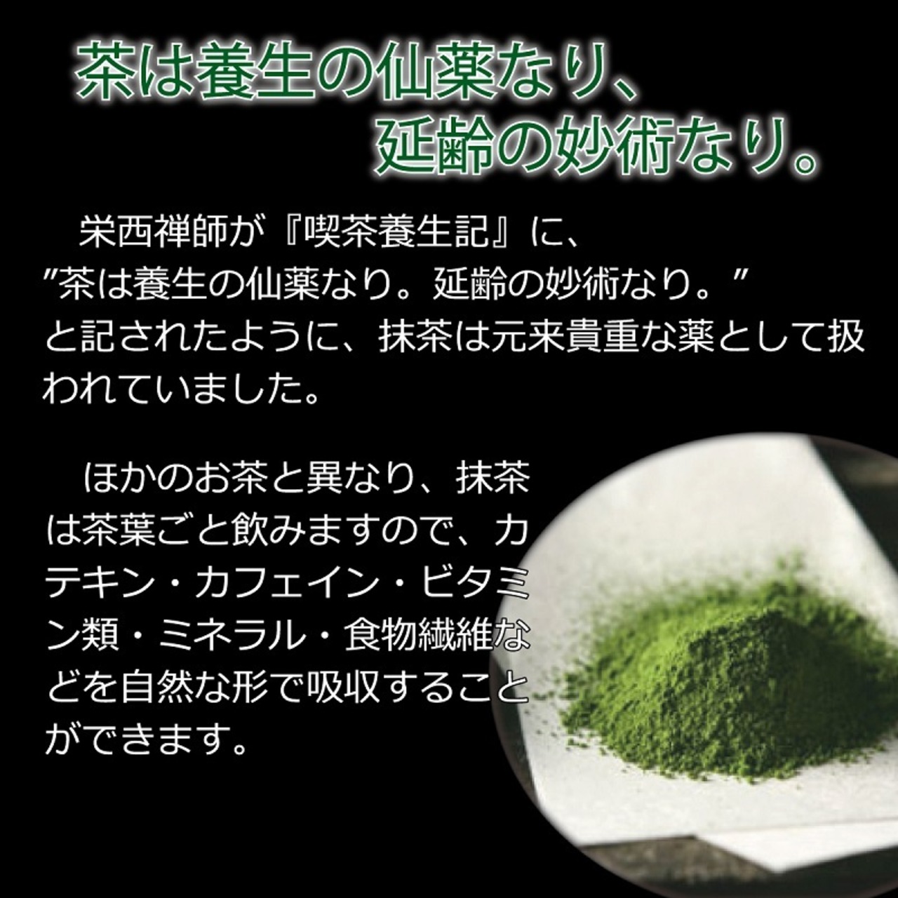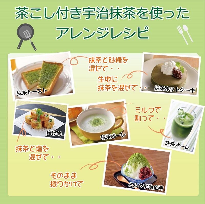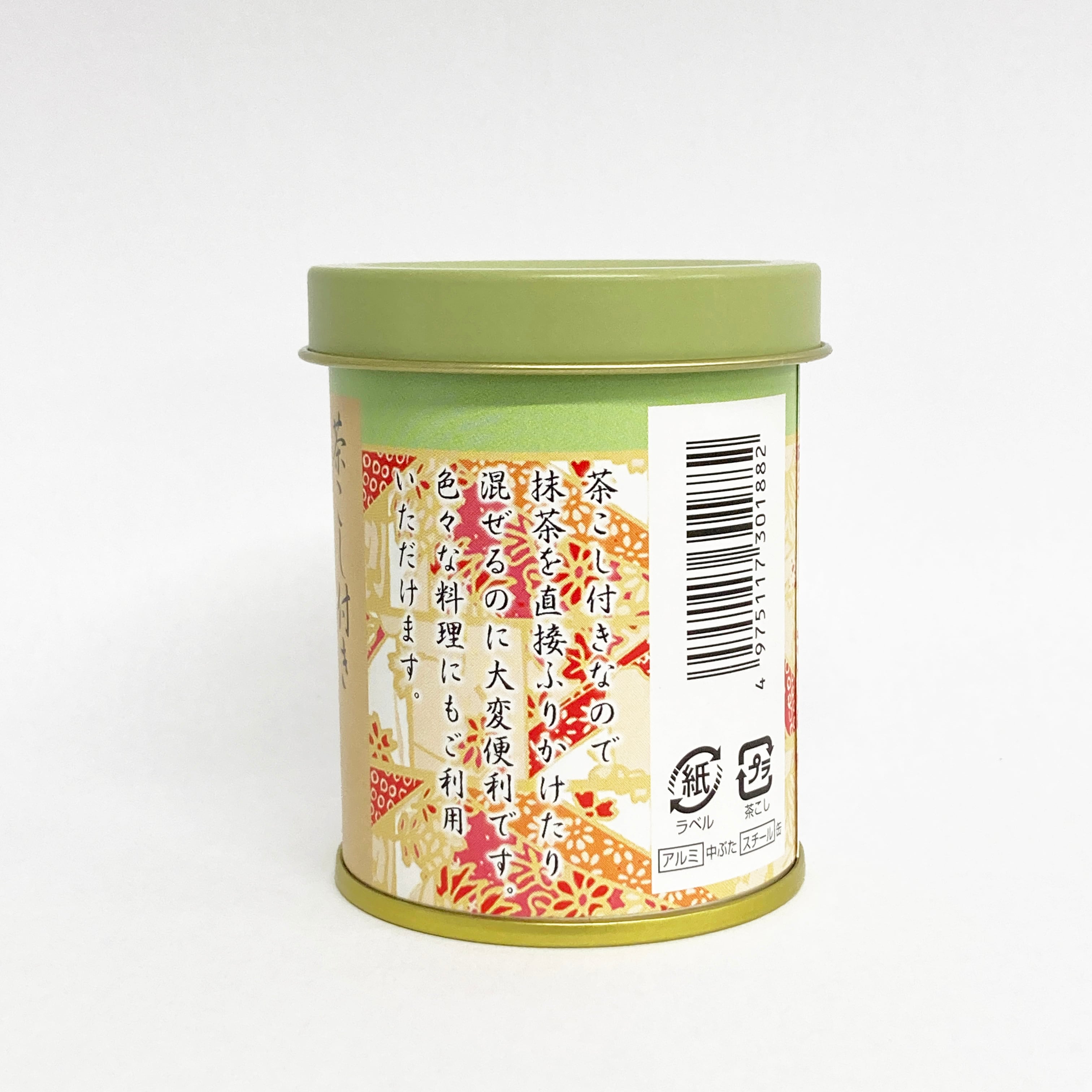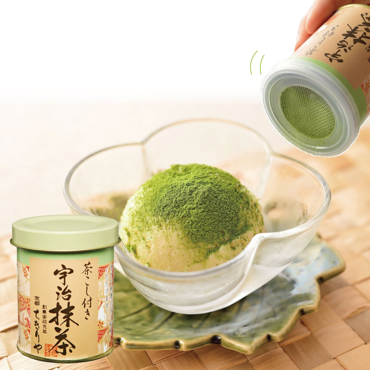 宇治抹茶を、昔ながらの石臼でゆっくりと時間をかけて丁寧に挽きあげました。茶こしがついているので、そのまま振るだけでサラサラとした抹茶がお楽しみいただけます。そのままかけて、抹茶と砂糖を混ぜて、ミルクと混ぜて、生地に混ぜて、抹茶と塩を混ぜて・・といろいろアレンジしてお楽しみください。