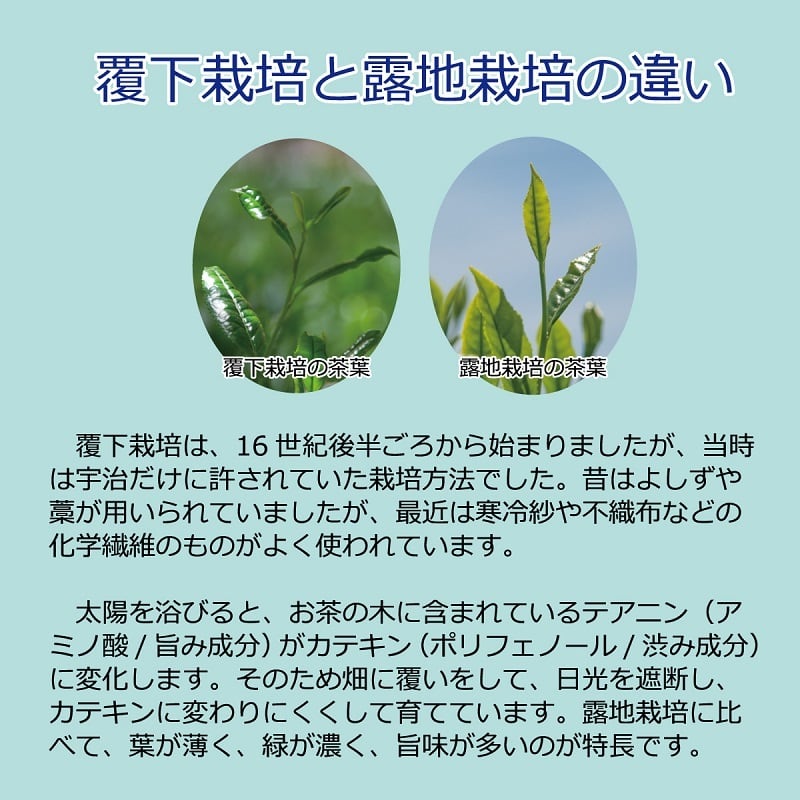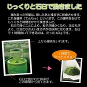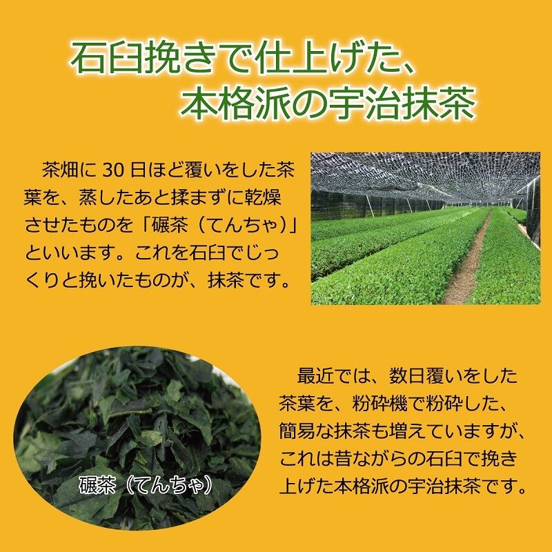 摘み取った茶葉は、蒸したあと揉まずに乾燥させます。これを碾茶(てんちゃ)といいます。この碾茶を石臼でじっくりと時間をかけて挽きました。石臼で挽くことにより、粒子が細かくなり、泡立ちがよく、口当たりのよいまろやかな抹茶になります。石臼で1時間挽いてできるのは、たった40gです。